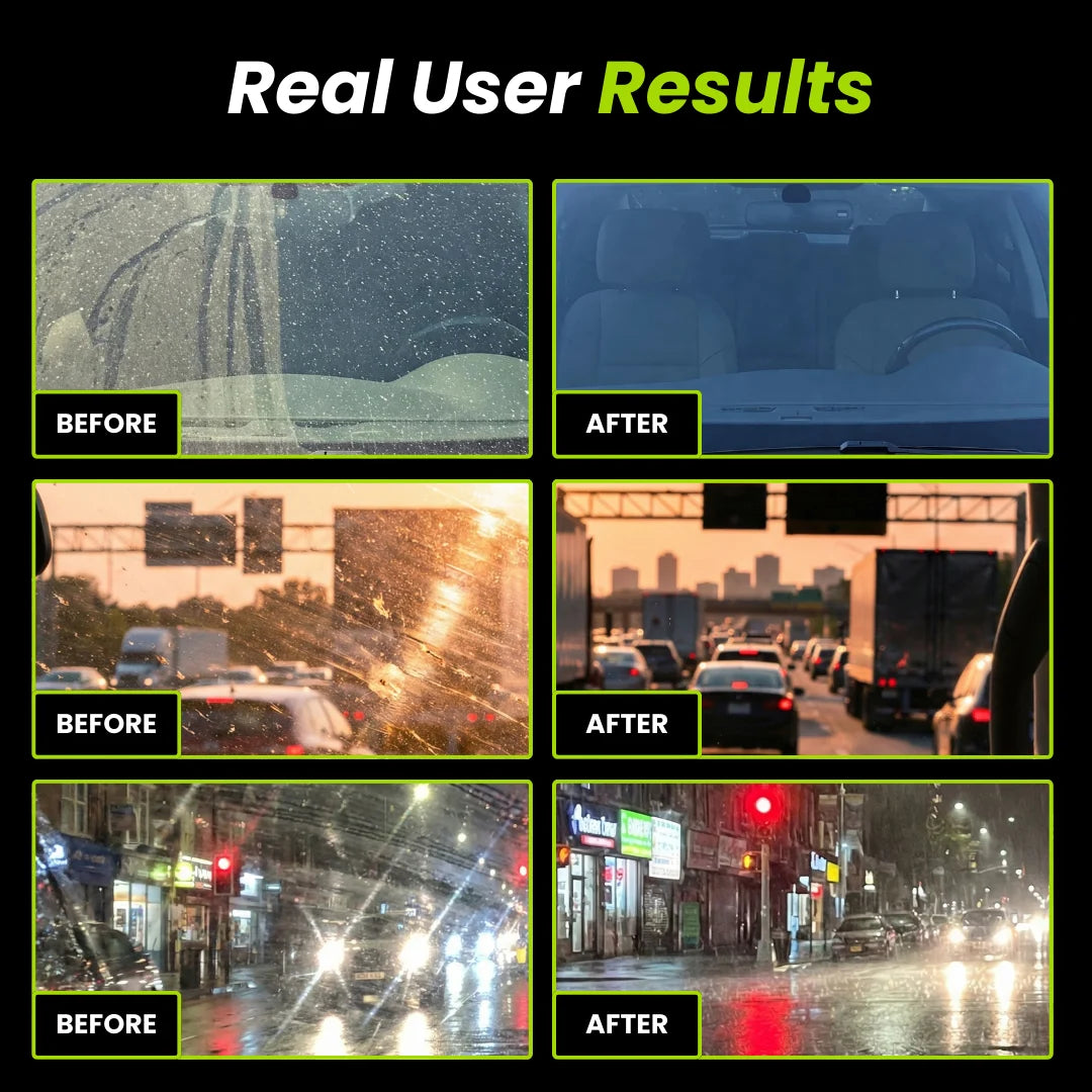 Oil film, traffic residue, and invisible buildup slowly form on your windshield, scattering light and making it harder to see—especially in harsh sunlight, rain, or at night.